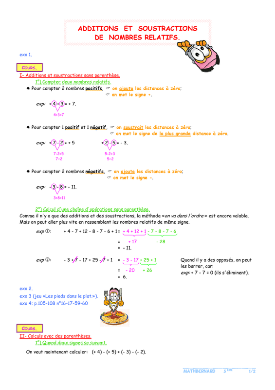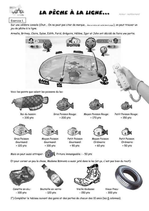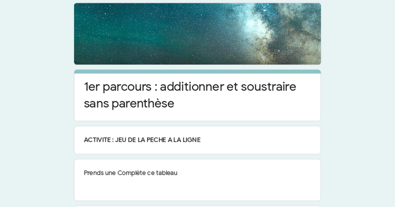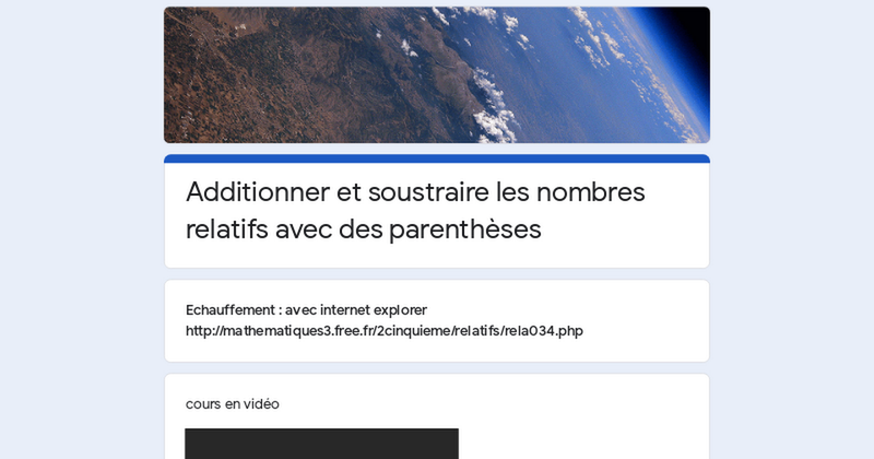 1er parcours : additionner et soustraire sans parenthèse ACTIVITE : JEU DE LA PECHE A LA LIGNE Prends une Complète ce tableau 1) Ecris le prénom de celui a fini dernier ? 0 points Your answer 2) Quel est le podium des 3 premiers joueurs ? Your answer Correction Quelle méthode peut-on expliquer pour additionner et soustraire des nombres relatifs ? vidéo de cours COURS A RECOPIER ex 1 : sans calculatrice ex 2 1 point Fanny a 70 points Fanny a -70 points Adèle a un score plus élevé que Fanny ex 3 1 point la bonne opération est- 1800- 2500+3300 + 2900 la bonne opération est -1800+2500-3300+2900 au final : il a plus gagné que perdu au final : il a plus perdu que gagné Submit Never submit passwords through Google Forms. This content is neither created nor endorsed by Google. Report Abuse - Terms of Service - Privacy Policy Forms
